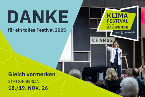 Ein erweitertes und vielfältiges Programm eröffnete neue Perspektiven, die Ausstellung GREENTERIOR setzte frische inhaltliche Schwerpunkte und mehr als 3600 Besucherinnen zeigten, wie groß das Interesse an der Bauwende bleibt. Zwei intensive Tage verwandelten die STATION Berlin in einen Ort lebendiger Debatte. Über 200 Referentinnen und 170 Partner diskutierten auf fünf Bühnen über die Zukunft des Bauens und machten spürbar, dass das Festival zu einem fest verankerten Treffpunkt für alle geworden ist, die die Bauwende vorantreiben. Die Bauwende zeigt sich längst nicht mehr als technisches Themenfeld, sondern als kultureller, gesellschaftlicher und politischer Veränderungsprozess, der Haltung verlangt und Gemeinschaft stärkt.
